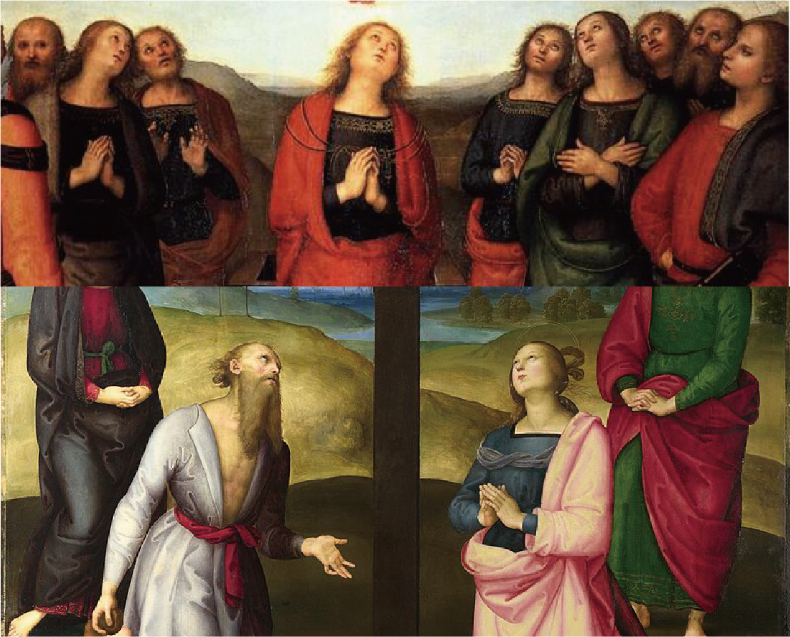 さらに画面下側の人々の表情はとても酷似しています。ペルジーノ工房で直接みた絵画表現を若きラファエロが吸収したのだろうというのが伝わりますね。