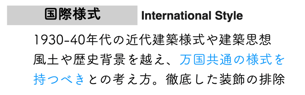国際様式は1920年代に西ヨーロッパで始まった建築運動ですが、用語の成立はアメリカです。それを牽引したのがMoMAの展覧会でした。