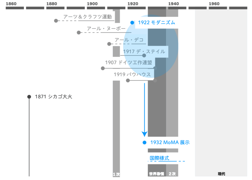今回取り上げる3つのキーワード—国際様式、ニューヨーク近代美術館(MoMA)、そしてニューバウハウス—は、まさにこの歴史的転換を象徴する存在です。1930年代から40年代にかけて展開されたこれらの動きは、現代のデザインにも深い影響を与え続けています。
