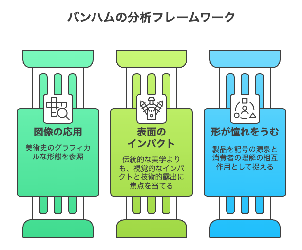 従来の美術史で用いられてきた図像学的手法を、デザイン対象に応用したものでした。しかし、バンハムの場合は、古典的な宗教画や神話的図像ではなく、SF映画、土木機械、超音速航空機、レーシングカー、紋章学、そして「テクノロジーとセックスの親和性についての根深い精神的傾向」といった現代的な象徴体系を分析対象としました。簡潔にいうと商品のデザインに隠された物語やメッセージを読み解くことに繋がります。