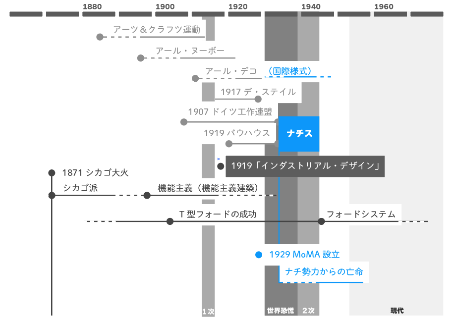 1930年代のアメリカがデザイン史における重要な転換点でした。西洋の近代デザイン史が一時休戦し、またアメリカで新たなデザイン史が誕生したのです。