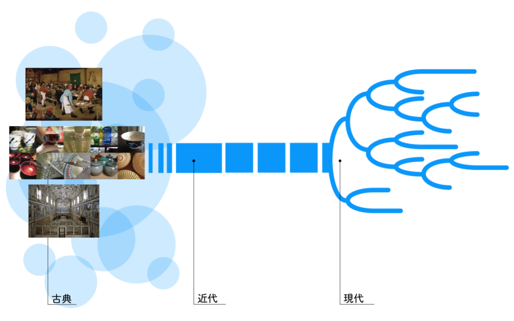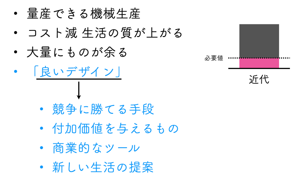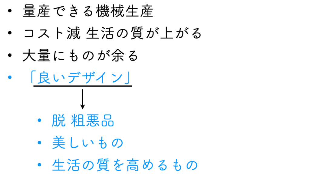 最初にあったのは、産業革命です。それまでは必要なものを手で作っていたのに、機械によって大量に作れるようになり、デザインも“設計”という意味での役割が大きくなっていきました。同じものを大量に、効率よく、どこでも作れる。それが「良い」とされた時代です。