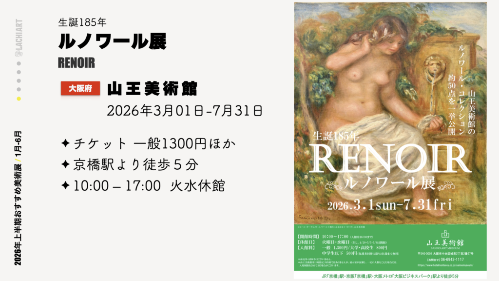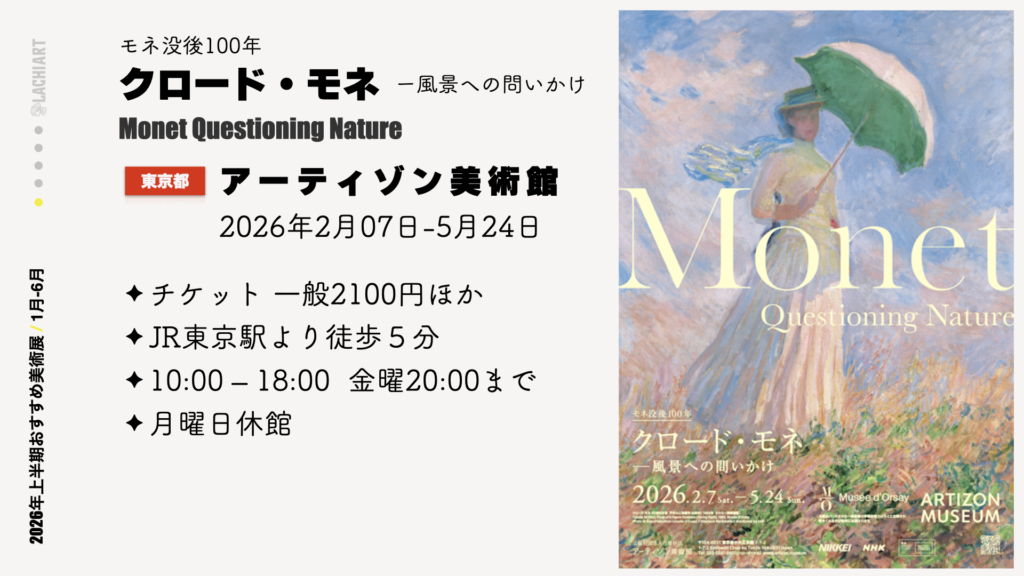 印象派に惹かれる方も、日本画の革新に興味がある方も、現代アートやデザインに関心がある方も、きっと心に響く展覧会が見つかるはずです。会期が重なる展覧会も多いため、複数の展覧会を組み合わせて巡るのも楽しいでしょう。2026年上半期、あなた自身の関心に沿って、美術館での豊かな時間をお楽しみください。