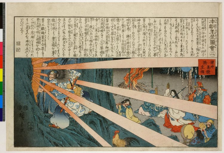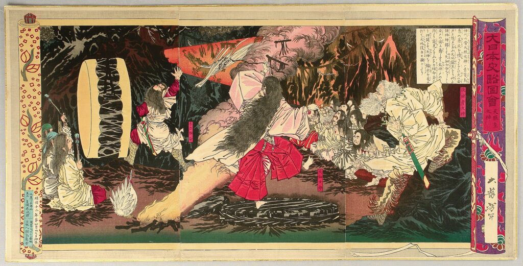 トドメは芸能の神、アメノウズメだ。彼女は乳房を露出し、腰紐をほどいて陰部まで曝け出し、桶を踏み鳴らしてトランス状態で踊り狂った。それを見た八百万(やおよろず)の神々は、一斉に大爆笑した。