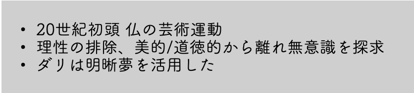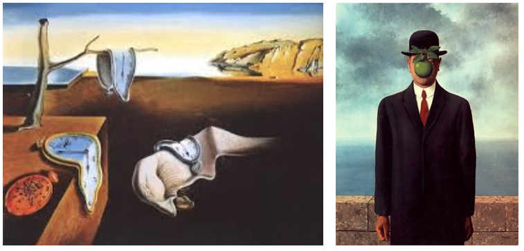 サルヴァドール・ダリは明晰夢を使い現実離れした幻想的な世界を写実的に描きあげています。また、同じくシュルレアリスムであるルネ・マグリットは、日常的なモチーフを非現実的に組み合わせ、現実と非現実の境界を曖昧にする手法や匿名性が現れています。