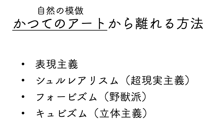 表現主義は内側の感情を表現し、シュルレアリスムは無意識の追求、フォービズムは感情に則した色彩表現を、キュビズムは多視点描写。