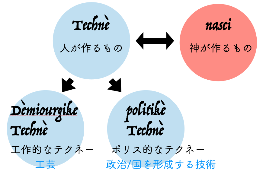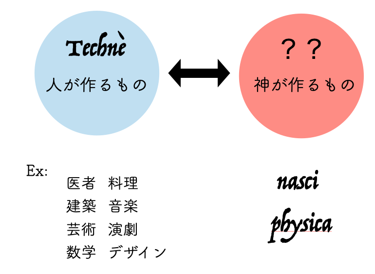古代の人々にとって、「人が作るもの(テクネ)」の対照的な位置にあるものは、「自然発生的なもの」「生まれつき備わっているもの」でした。